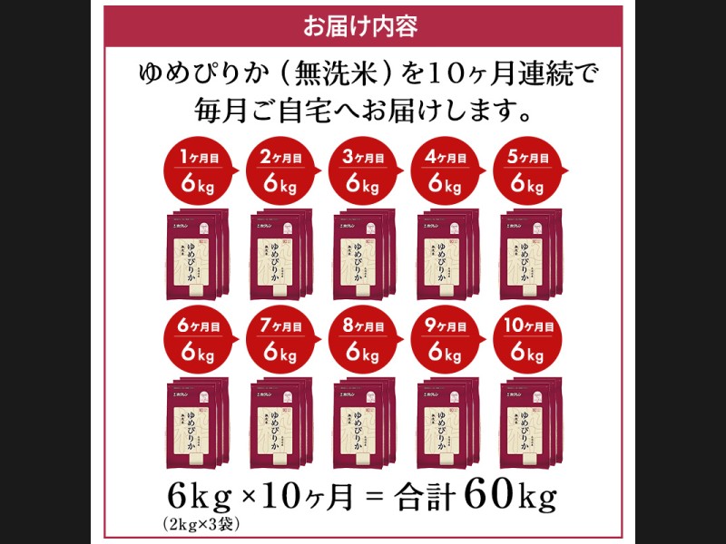 10ヵ月 定期便 ホクレンゆめぴりか(無洗米6kg(2kg×3))※チャック付袋 お米 米 ごはん 無洗米 白米 国...