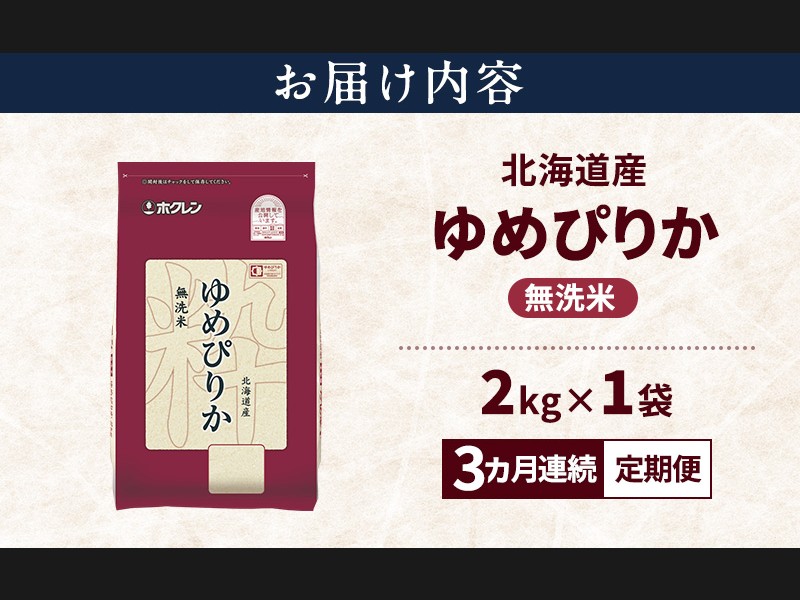 サイズ: ホクレン ゆめぴりか 無洗米 2kg(2kg×1袋)を3ヵ月連続で毎月10~20日にお届けします。