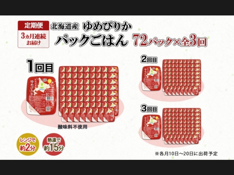 北海道産 『ゆめぴりか』パックごはん(150g) 72パック×全3回をお届けします。