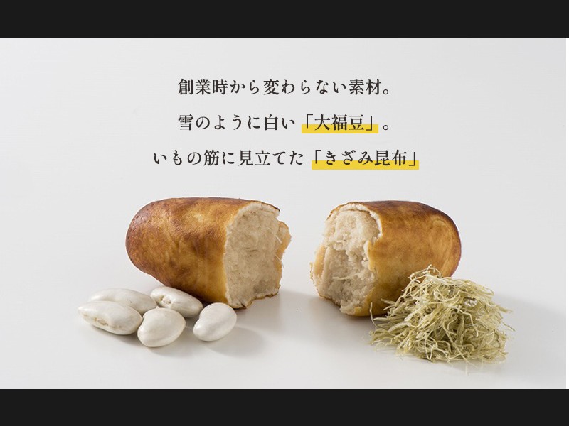 芋を使わず北海道産の大福豆を主原料に餡を作り、芋の筋に見立てて細かい昆布を入れ、 焼芋の色にするため卵正油を塗って焼いています。