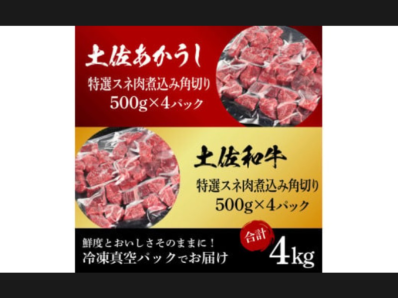土佐あかうし&土佐和牛2種食べ比べ(500g×8パック)4キロ 4kg 特選スネ肉煮込み角切り 牛肉 赤牛 和牛 ...