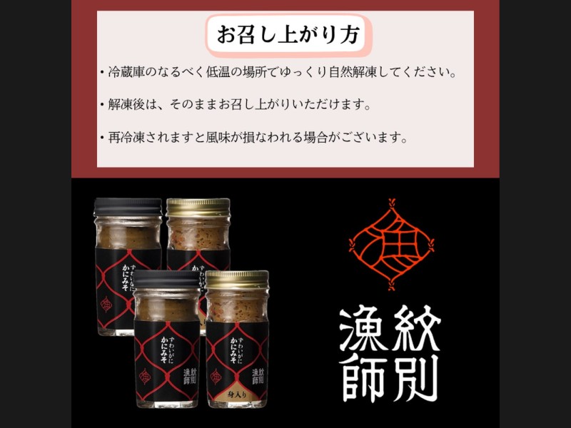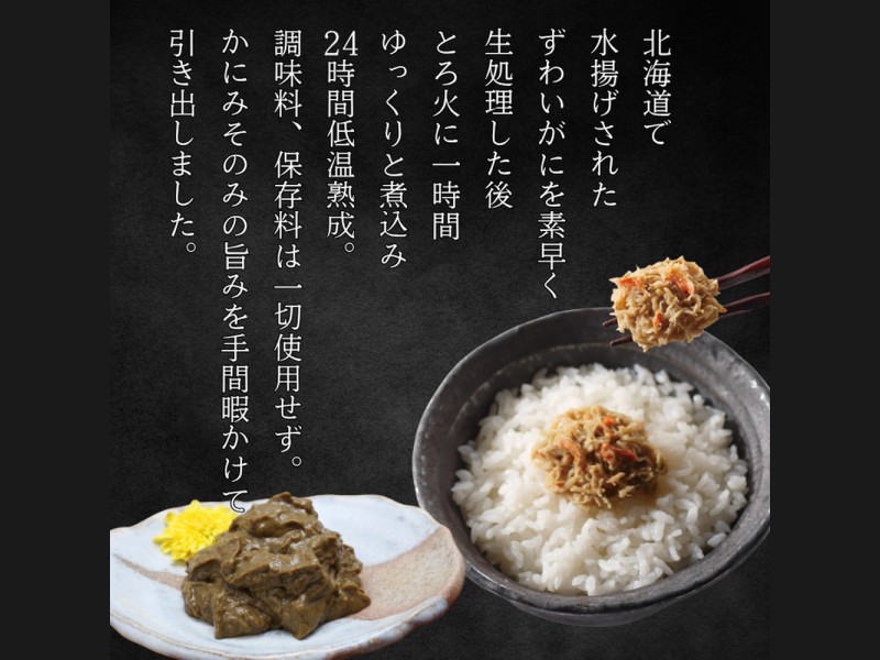 塩茹でしたずわいがにを素早く処理し、生のみそを1時間かけてゆっくり煮込み24時間低温熟成しました。塩・調味料は一切使用せず、かにみそ本来の塩分で仕上げております。※添加物や保存料を使用しておりませんので開栓後は概ね3日以内でお召し上がりください。