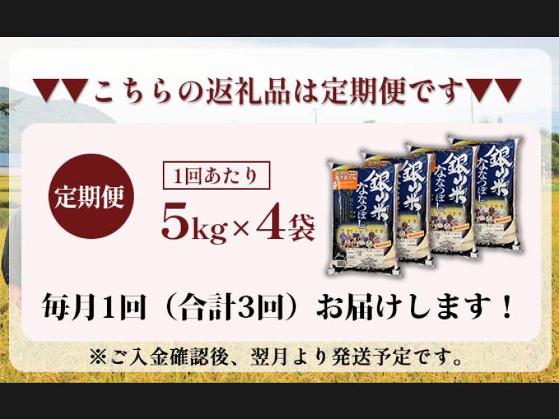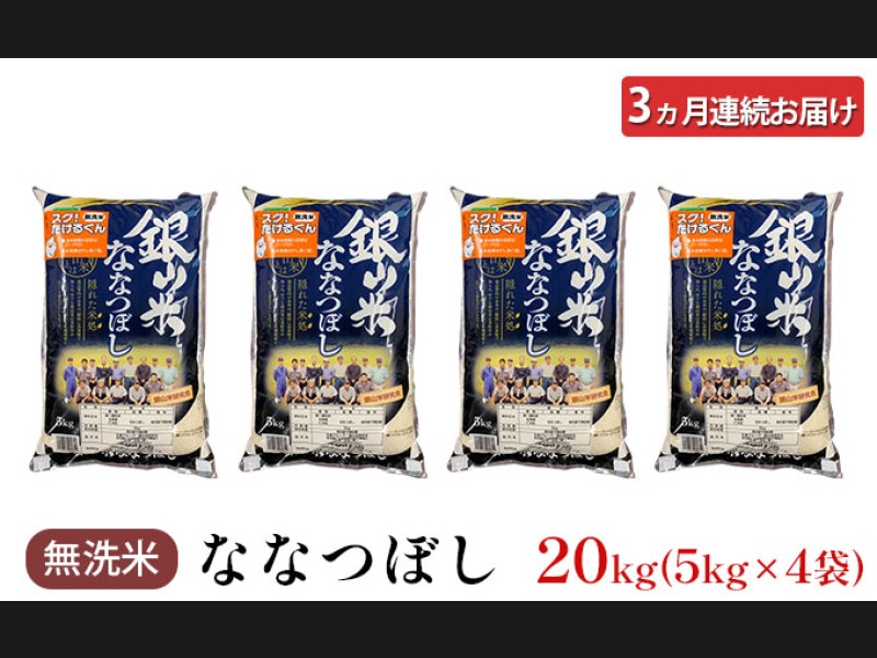 3ヵ月 定期便 銀山米研究会の無洗米<ななつぼし>20kg(5kg×4袋) ライス 白米 精米 ブランド米 おにぎ...
