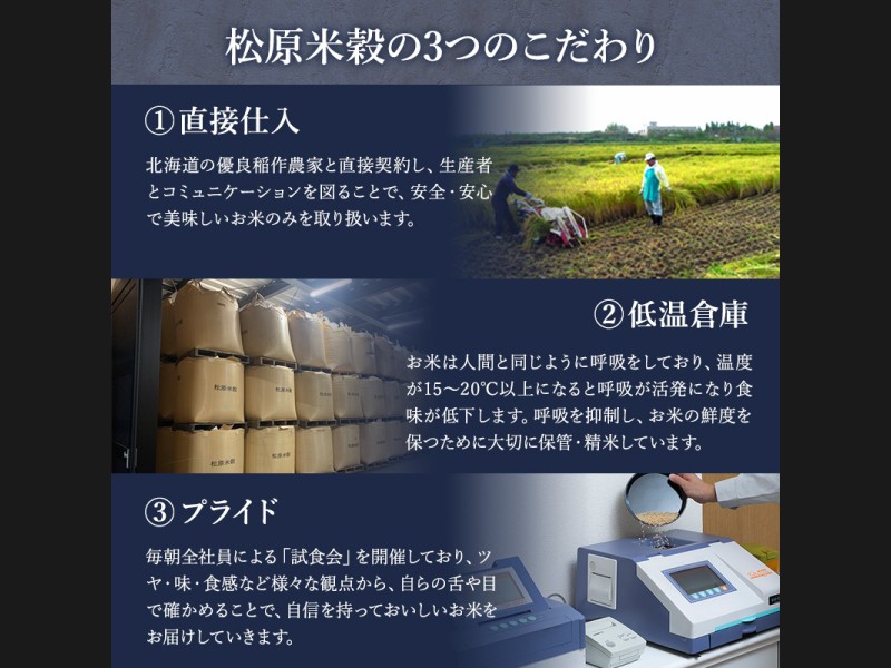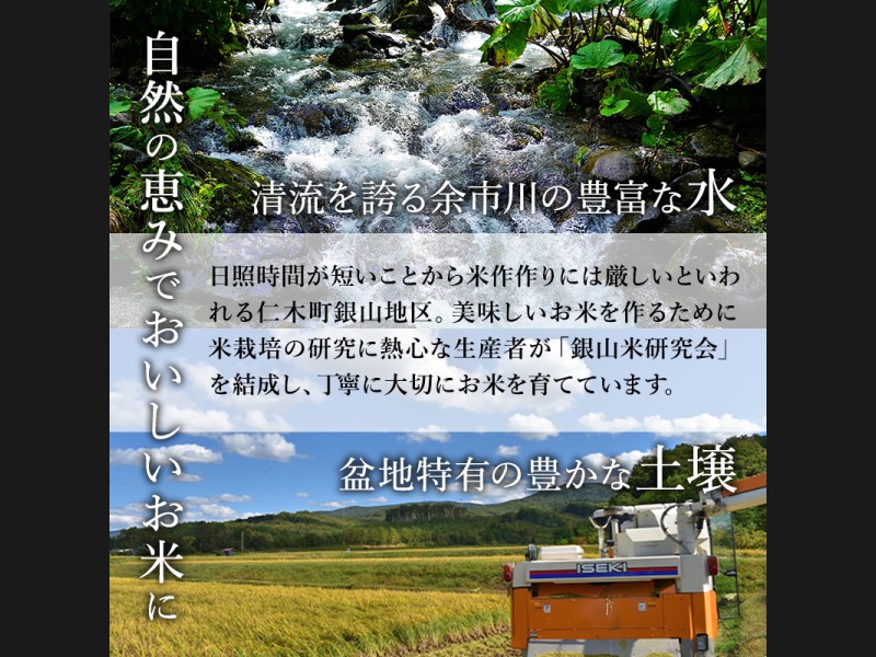 北海道随一の清流を誇る余市川を湛え、盆地特有の肥沃な土壌に恵まれる一方で、日照時間が短いことから米作作りには厳しいといわれる仁木町銀山地区で、美味しいお米を作るべく米栽培の研究に熱心な生産者が「銀山米研究会」を結成。わが子のように大切に育てたお米です。