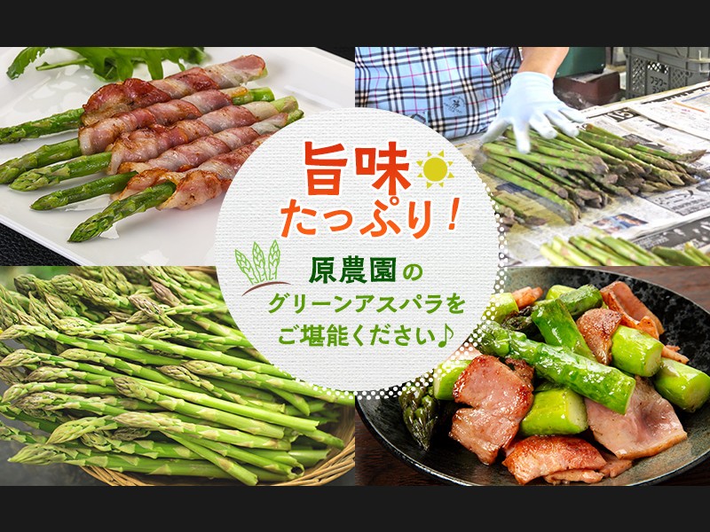 アスパラ専門農家「原農園」では、旨味をたっぷり蓄えた有機肥料をふんだんに使った栄養満点の畑でグリーンアスパラを育てています。しっかりと成長したアスパラガスを毎朝一本一本手作業で丁寧に収穫するため、根元まで柔らかく、美味しいアスパラガスをお届けすることができます。