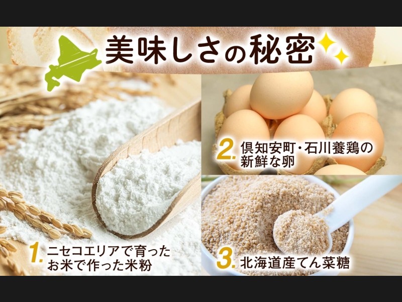 ニセコ町の米粉と石川養鶏の新鮮な卵、甜菜糖のみで作ったクリームを贅沢に使用しています。