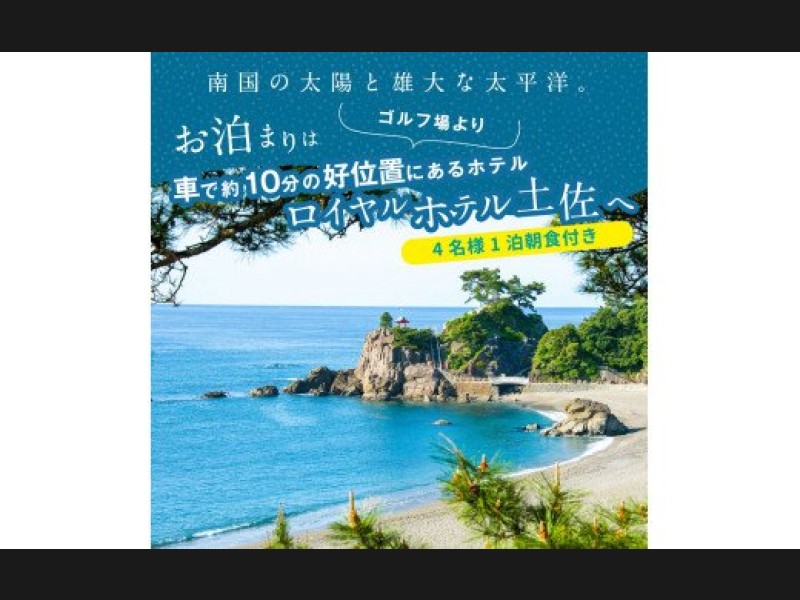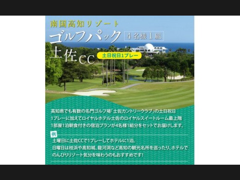 高知県でも有数の名門ゴルフ場 土佐カントリークラブ「土日祝日1プレー」と、Royal Hotel 土佐の1泊朝食付きの宿泊プラン4名様分がセットになった商品です。