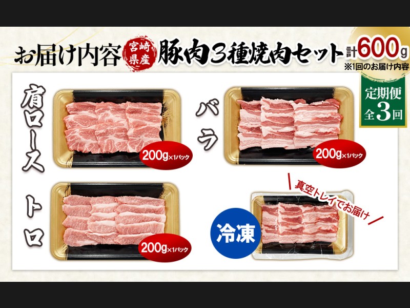 【3ヶ月連続お届け】希少部位・豚トロ入り!宮崎県産 豚焼肉3種定期便 合計1.8kg 真空パック 200gずつの...