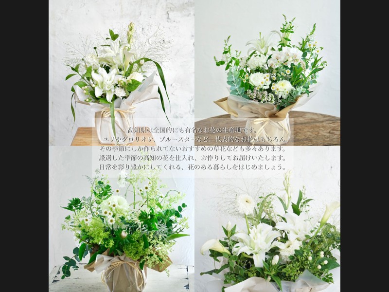芸西村や高知で育てられた季節感あふれる旬の生花を中心に、ふんわり自然にいけたアレンジです。そのまま飾って頂けるデザインになっております。