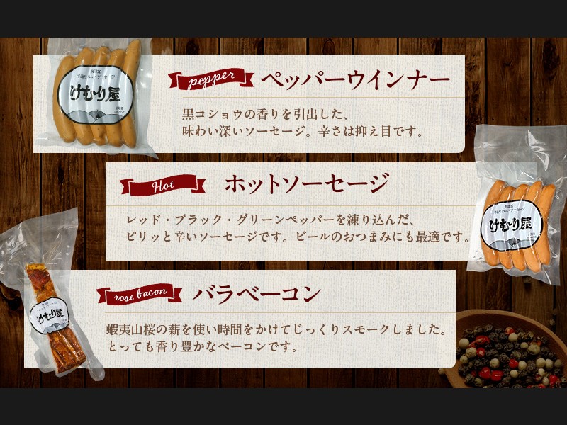 新鮮な北海道産の豚肉と塩・香辛料だけを使い、家族三人だけでソーセージ・ベーコンを造っています。