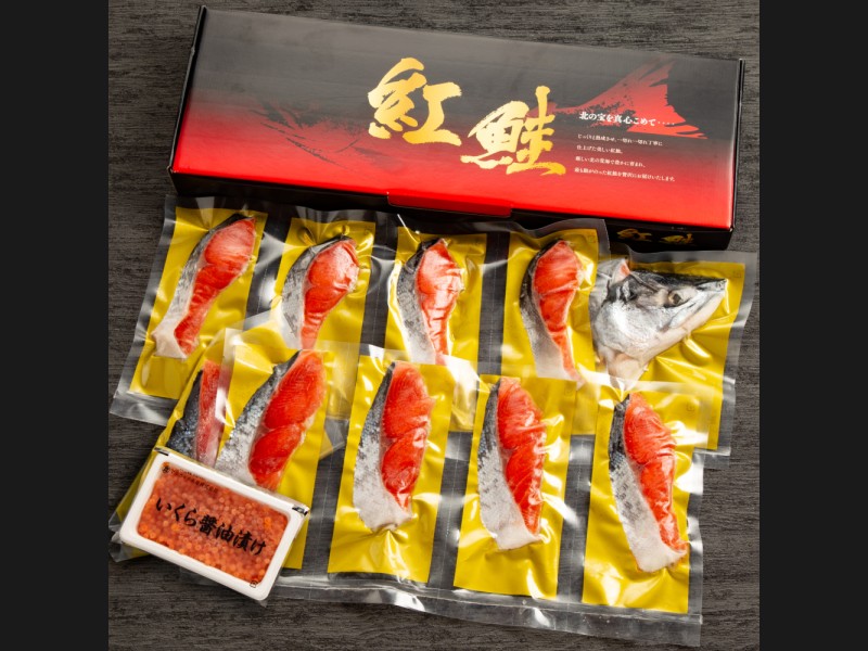 塩鮭の中では大変人気の高い紅鮭と、贈答に人気のあるますいくら醤油漬けをセットでお届けいたします。