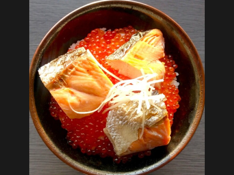 あつあつの白飯に焼いてほぐした紅鮭と、その上にいくら醤油漬を掛けた親子丼で食べるのがオススメです!