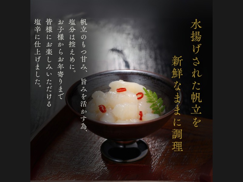 そんな帆立を素材を活かした控えめな塩分で塩辛とじゃん辛にしました。