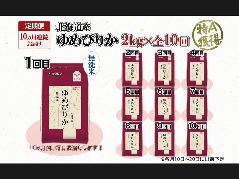 北海道の特A米『ゆめぴりか』無洗米 2kg×全10回をお届けします。