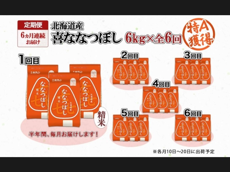 定期便 6ヵ月連続6回 北海道産 喜ななつぼし 精米 2kg×3袋 計6kg 米 特A 白米 小分け お取り寄せ ななつ...
