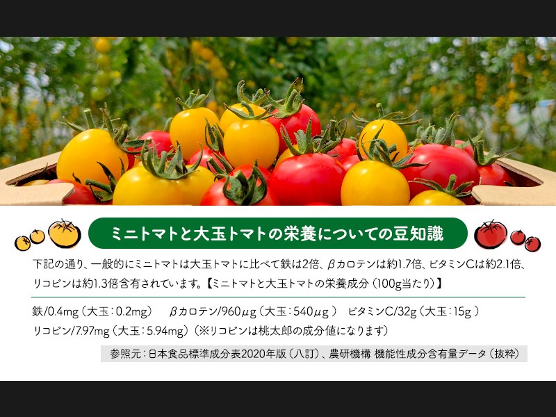 下記の通り、一般的にミニトマトは大玉トマトに比べて鉄は2倍、βカロテンは約1.7倍、ビタミンCは約2.1倍、リコピンは約1.3倍含有されています。