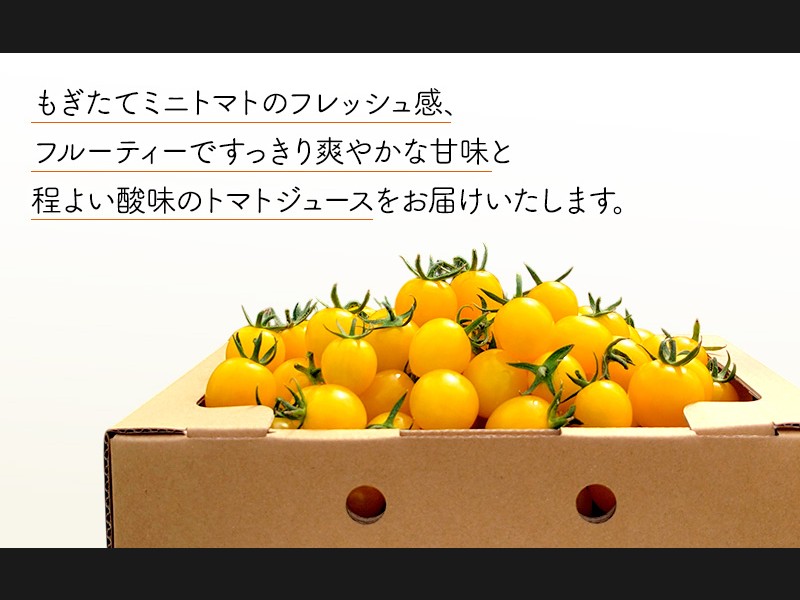 もぎたてミニトマトのフレッシュ感、フルーティーですっきり爽やかな甘味と程よい酸味のトマトジュースをお届けいたします。