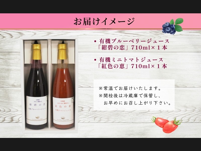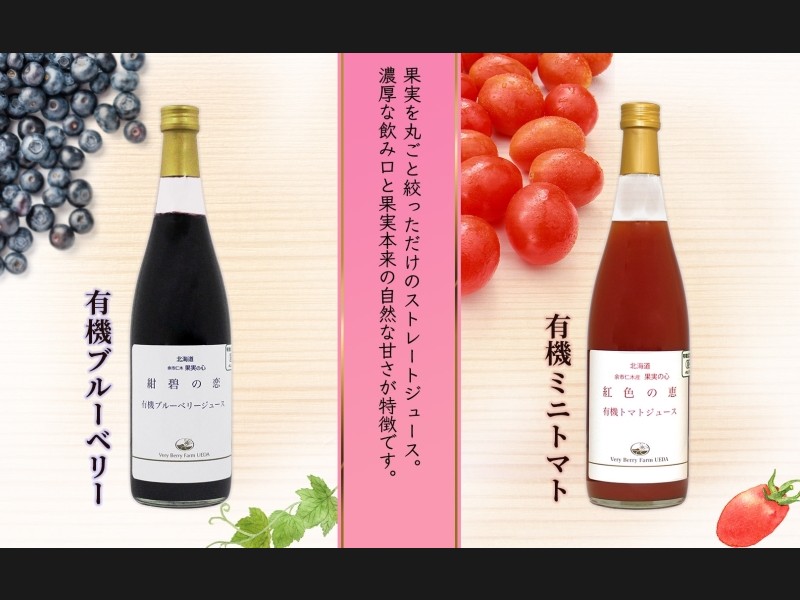 北海道の農園で、人の手で丁寧に有機栽培された「ブルーベリー」と「ミニトマト」のジュースをセットにしました。