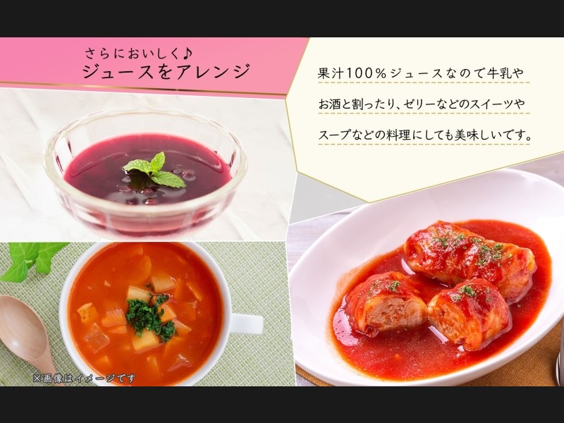 料理にもアレンジでき、ブルーベリージュースはゼリーなどのスイーツに、ミニトマトジュースはスープやパスタのソースなどに使うのもおすすめです。