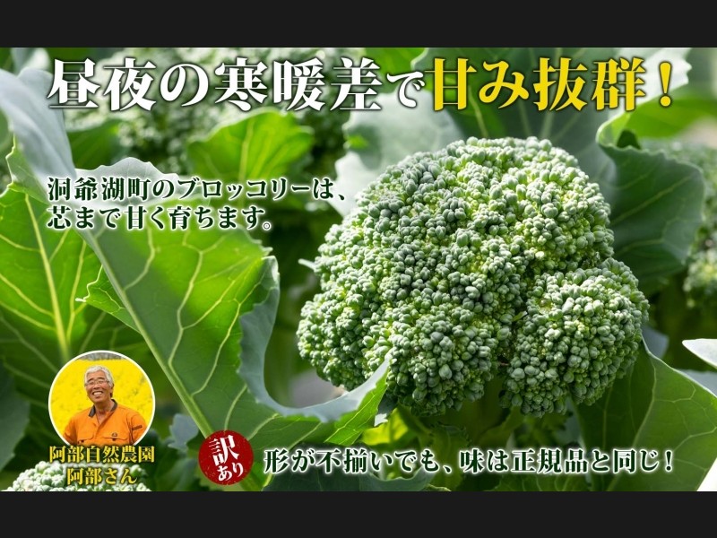 農業一筋、40年、地元でも一目置かれる農家さん「阿部自然農園」の阿部さんが育てたブロッコリーです。噴火湾を一望できる、大自然の中の畑で、丹精こめて育てられた阿部さんのブロッコリーを使いやすい大きさに手作業で一つ一つ包丁をつかいカットし、さっと下ゆでをし、バラ凍結しています。そのため、好きな分だけ、簡単にお使いいただけます。彩りがほしいとき、お湯でさっと戻して添えたり、お料理の具材として、冷凍のまま炒め物や、カレーやシチューなどにも使えて便利です。形がふぞろいなど、規格外のブロッコリーを使用しているため、訳ありとして出品いたします。