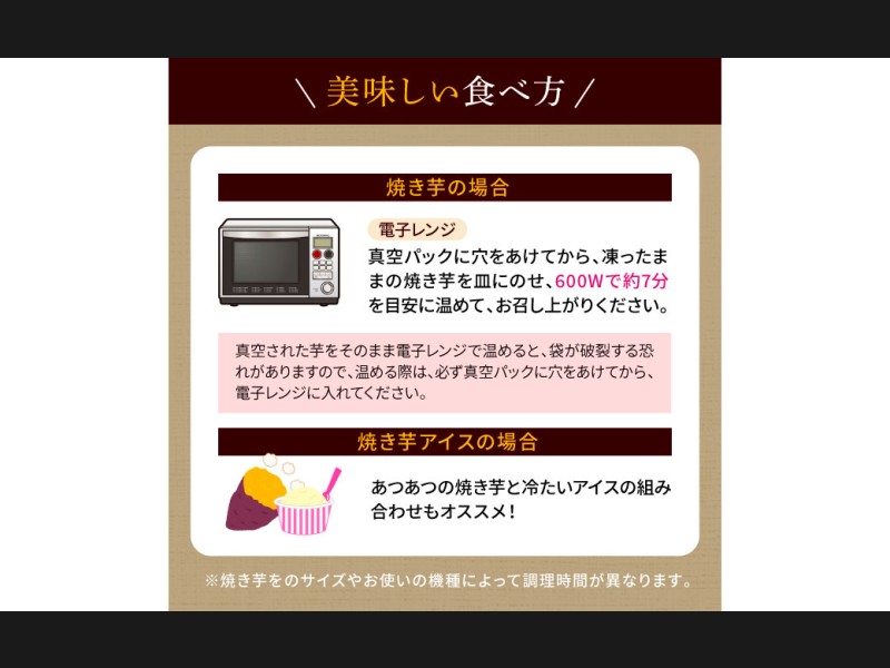 真空された芋をそのまま電子レンジで温めると、袋が破裂する恐れがありますので、温める際は、必ず真空パックに穴をあけてから、電子レンジに入れてください。
