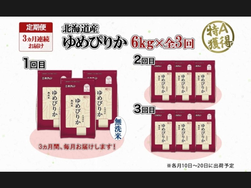 北海道の特A米『ゆめぴりか』無洗米 6kg(2kg×3袋)×全3回をお届けします。