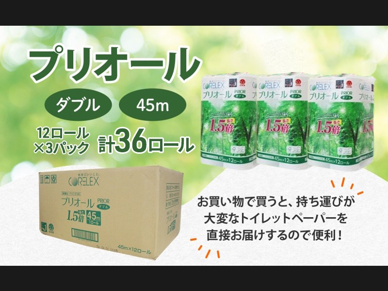 プリオール・ピコ トイレット ペーパー 1.5倍巻き ダブル 45m 計36ロール (12ロール×3パック) 日本製 ま...