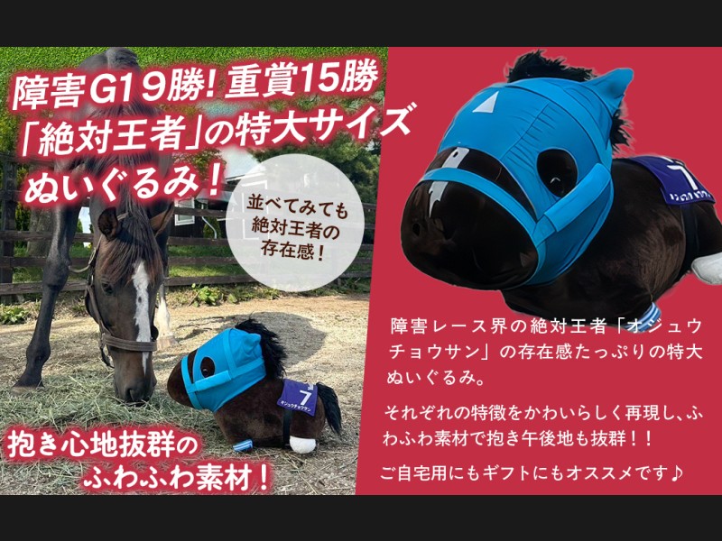 障害レース界の絶対王者「オジュウチョウサン」の存在感たっぷりの特大ぬいぐるみです。