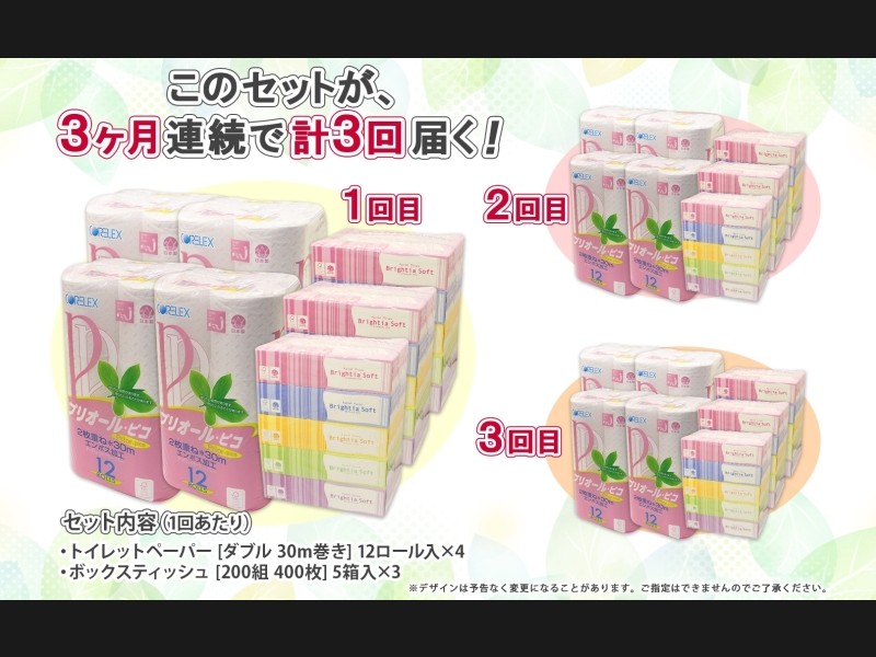 北海道 3ヶ月連続3回 定期便 あんしん備蓄セットトイレットペーパー ダブル 48ロール ティッシュ ペーパ...