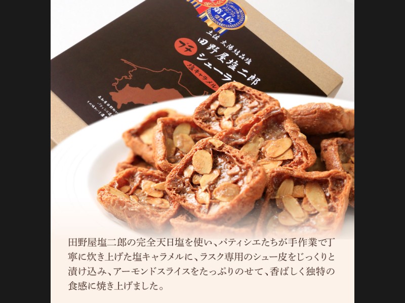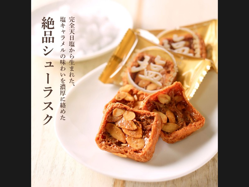 その絶品天日塩を使い、パティシエたちが手作業で丁寧に炊き上げた塩キャラメルに、ラスク専用のシュー皮をじっくりと漬け込み、アーモンドスライスをたっぷりのせて、香ばしく独特の食感に焼き上げました。