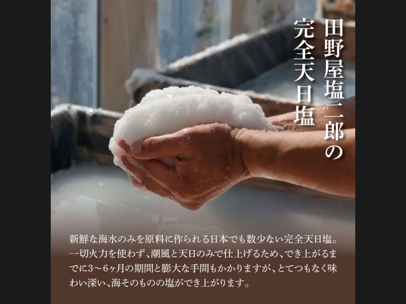 雄大な太平洋に面した高知県田野町で、新鮮な海水のみを原料に作られる日本でも数少ない完全天日塩「田野屋塩二郎」。