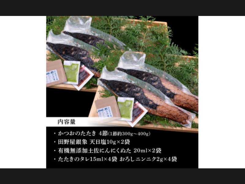 ・かつおのたたき2節(1節:約300g~400g)、田野屋銀象 天日塩10g×2袋、たたきのタレ15ml×2袋、おろしニンニク2g×2袋