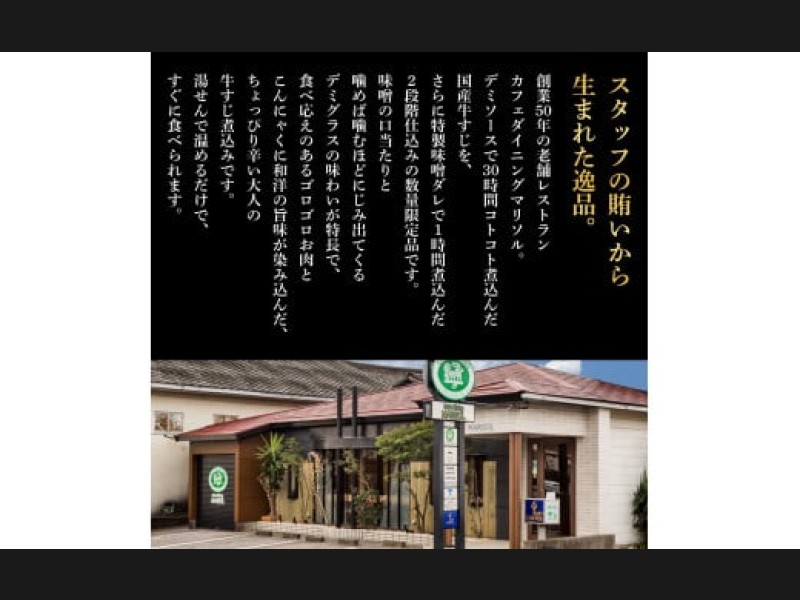 デミソースで30時間コトコト煮込んだ国産牛すじを、さらに特製味噌ダレで1時間煮込んだ2段階仕込みの数量限定品です。