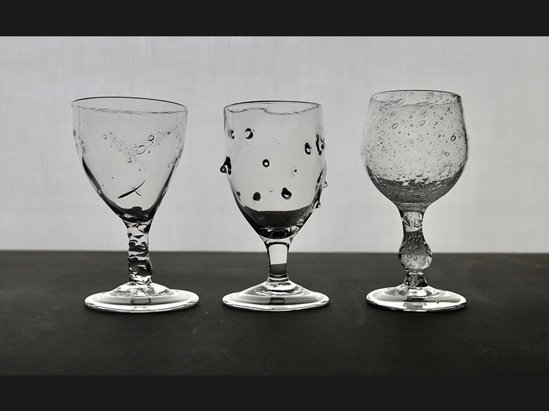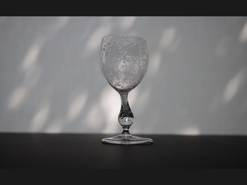 無色透明なガラスを宙吹きという技法を使い、一点ずつ型を使わずフリーハンドで制作しています。