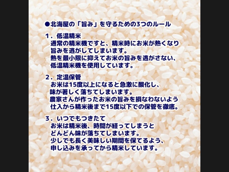 お米は精米後、時間が経ってしまうとどんどん味が落ちていきます。少しでも長く美味しい期間を保てるよう、北海屋では申し込みを承ってから精米しています。
