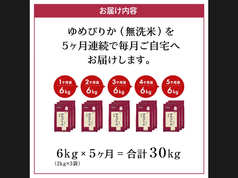 5ヵ月 定期便 ホクレンゆめぴりか(無洗米6kg(2kg×3))※チャック付袋 お米 米 ごはん 無洗米 白米 国...