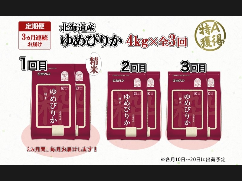 定期便 3ヵ月連続3回 北海道産 ゆめぴりか 精米 4kg 米 特A 獲得 白米 ごはん 道産 4キロ 2kg ×2袋 小分...