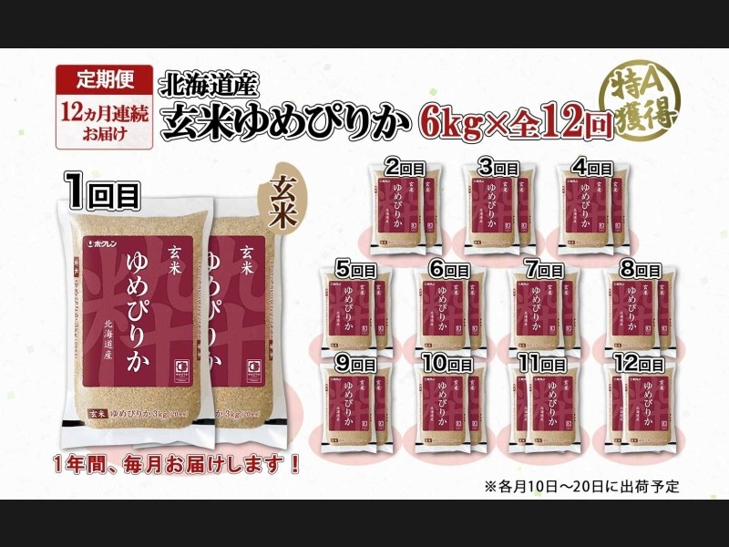 定期便12ヵ月連続12回 北海道産 ゆめぴりか 玄米 3kg×2袋 計6kg 小分け 米 国産 ごはん グルメ 食物繊維...