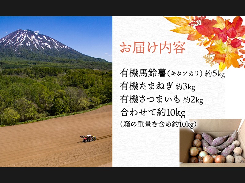 サイズ: 有機馬鈴薯(キタアカリ)約5kg、有機たまねぎ約3kg、有機さつまいも約2kg