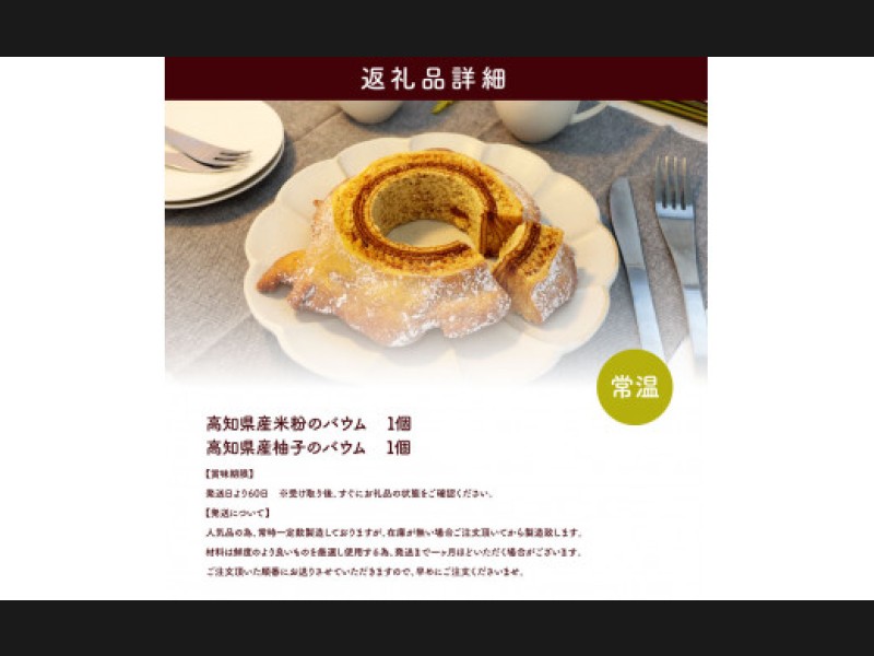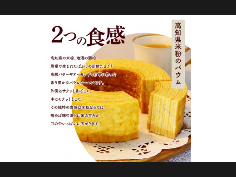 高知県産米粉のバウム:高知を代表する米どころの米粉と、地酒の酒粕、農場で生まれたばかりの新鮮たまごと北海道産の高級バターやアーモンドで丁寧に作った香り豊かなバウムクーヘンです。外側はサクッと香ばしいのに、中はモチッ!とした、その独特の食感は米粉ならでは。噛めば噛むほどに甘みが口の中いっぱいに広がります。素朴さを持ち合わせた、じっくり味わってほしいバウムクーヘンです。 高知県産柚子のバウム:日本を代表する柚子どころ、柚子ペーストを贅沢に使用したバウムクーヘン。たまごの優しい風味にそっと寄り添うような、柚子の香り。二つの素材が引き立つようにクセの少ない米粉をベースにしており、少しだけもっちりとした食感もお楽しみいただけます。上品なさわやかさに、高知の豊かな自然を感じてください。乳化剤、膨張剤、保存料不使用、グルテンフリーのバウムクーヘンです。