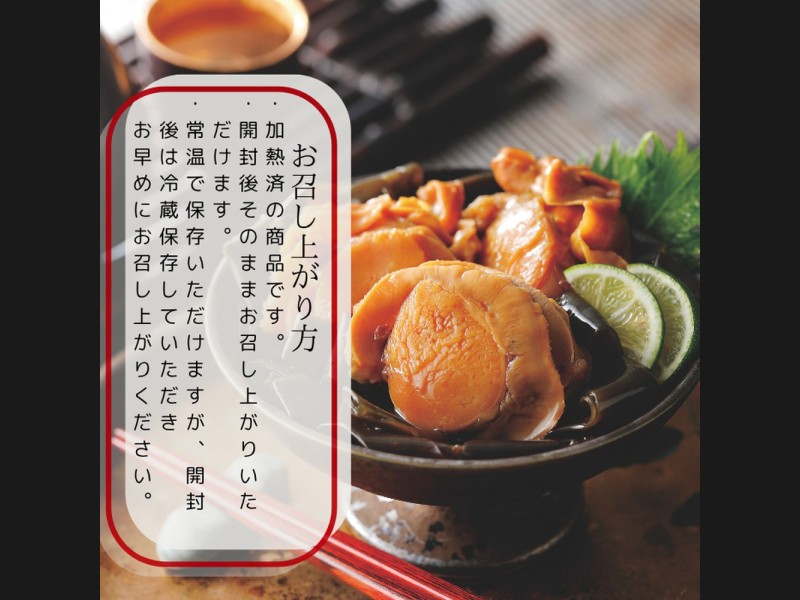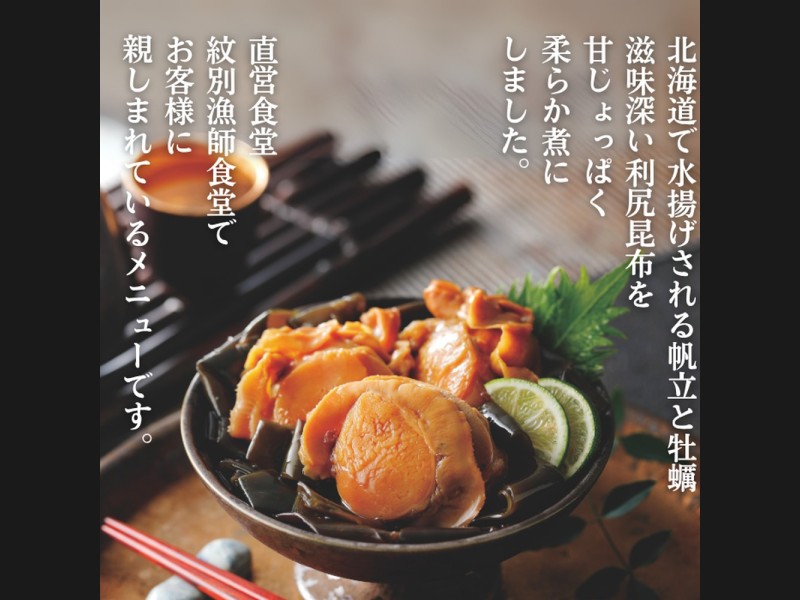北海道沖で水揚げされた新鮮な帆立と牡蠣を厳選。たっぷりの利尻昆布と一緒に甘じょっぱく煮つけました。漁師町ならではのシンプルな味付けは飽きの来ない、親しみやすいおいしさです。