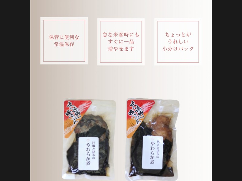 10-540 【お手軽調理】帆立と昆布のやわらか煮・牡蠣と昆布のやわらか煮 ハーフサイズ各1個【紋別漁師食...