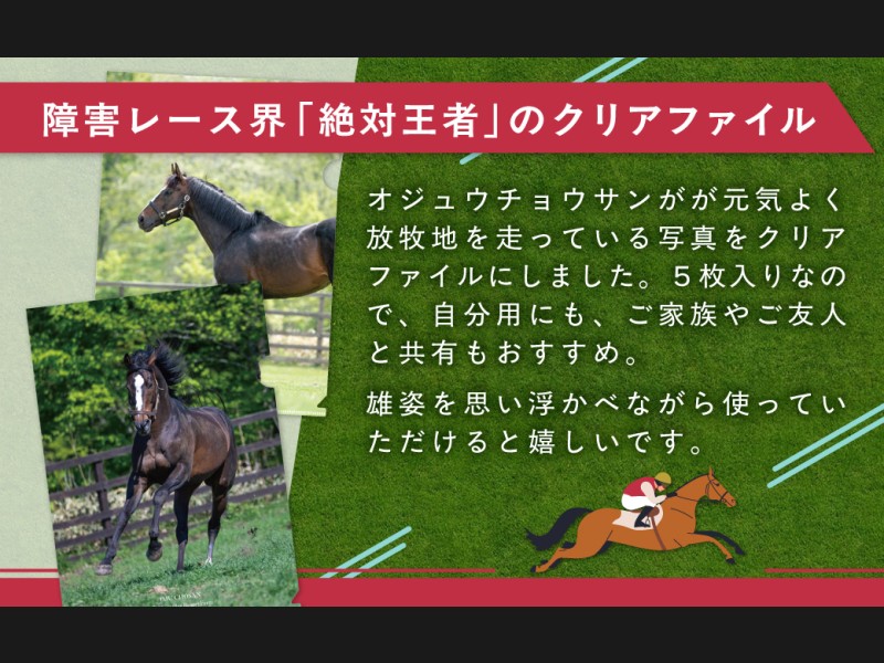 5枚入りなので、是非、日常の書類等を保管する際や家族、友人と共有して、オジュウチョウサンの雄姿を思い浮かべながら使ってほしいです。