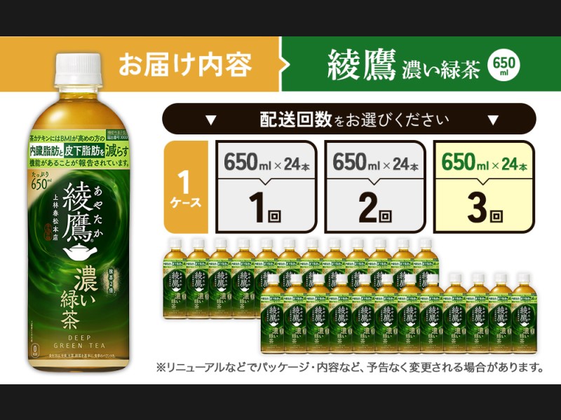 (3回定期便)綾鷹 濃い緑茶 650ml PET【コカ・コーラ】ペットボトル 1ケース(24本) 定期便 3回(72本) ...