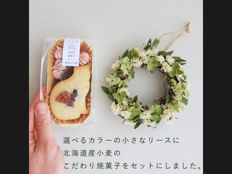 富良野花七曜がお届けする、カラーが選べるセミオーダーリースとねこクッキーがかわいいこだわり素材の焼菓子のセットです。