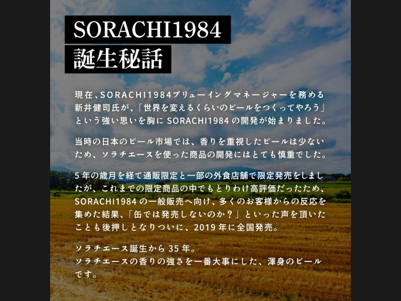 「SORACHI1984」誕生までには、多くの人によって紡がれてきた35年に亘るストーリーがあり、その根底にある100年以上前の開拓使醸造所創業からのDNA「美味しいビールをお届けしお客様に笑顔になっていただきたい」という想いと共にお楽しみください。
