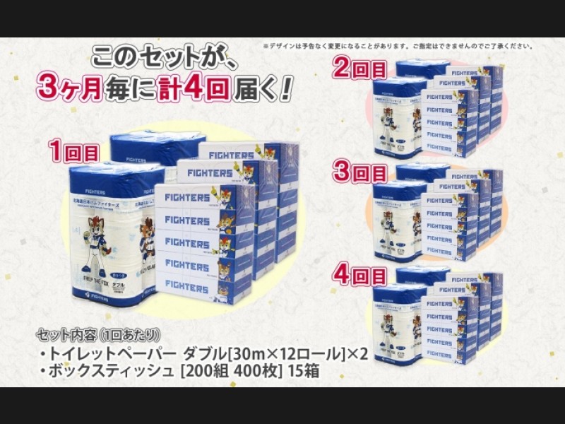 定期便 3カ月毎全4回 北海道産 日本ハムファイターズ トイレットペーパー 30m 24ロール ボックスティッ...