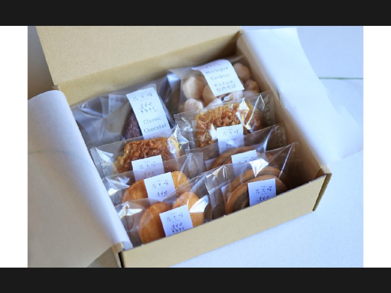 <井上さんの牡丹そばメレンゲ、花七曜のクラシックショコラ、江花珈琲のうずまきクッキー、黒糖くるみチュイル、マドレーヌ>