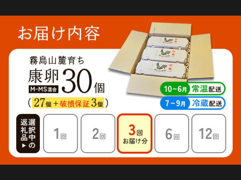 卵【3回定期便】 霧島山麓育ち こだわり卵 康卵 計 30個(27個 + 割れ保証 3個)3回 計 90個(81個 + 割...