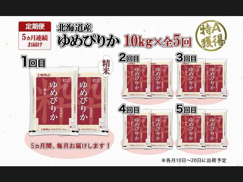 北海道の特A米『ゆめぴりか』精米 10kg(5kg×2袋)×全5回をお届けします。